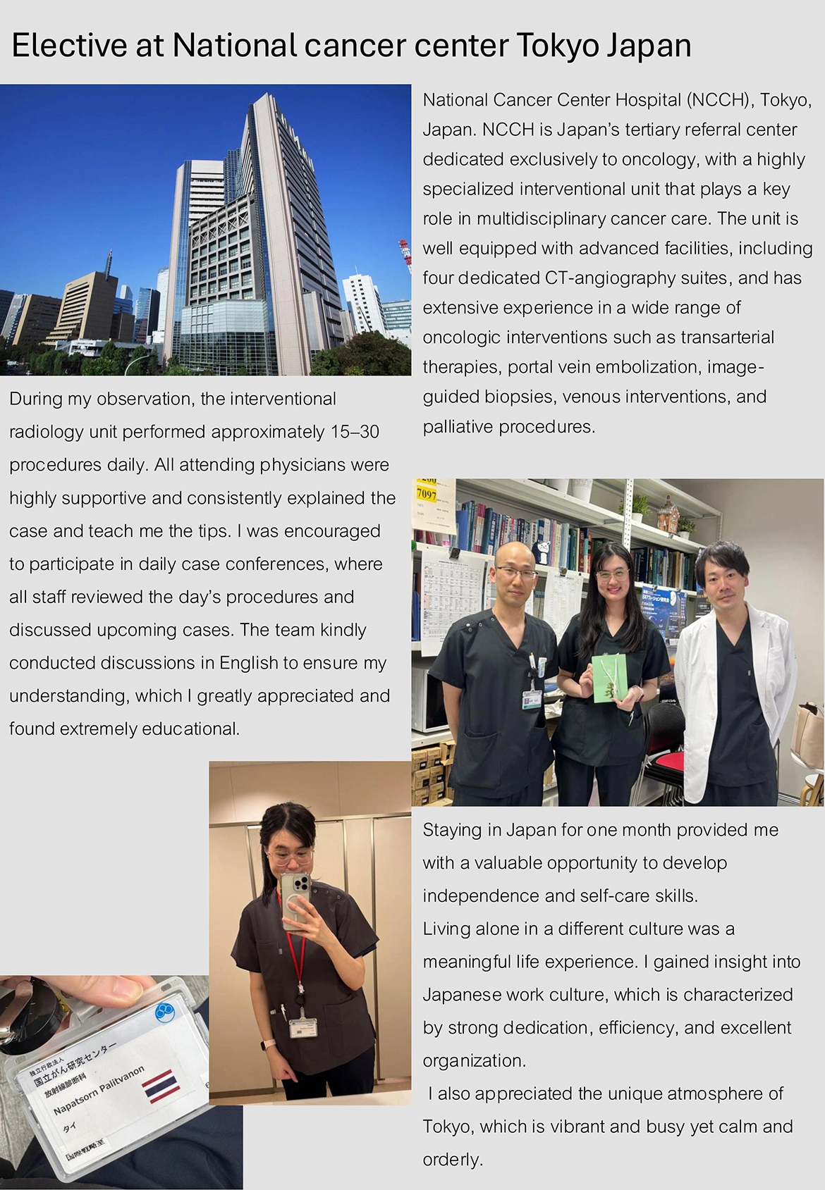The program was conducted under the supervision of Dr. Miyuki Sone, Chief of the Department of Diagnostic Radiology and Director of the Interventional Radiology Center at the National Cancer Center Hospital, Tokyo, Japan. During the exchange, Dr. Napatsorn gained in-depth exposure to advanced diagnostic imaging techniques and interventional radiology procedures in oncologic care, while observing multidisciplinary approaches to cancer management in a leading tertiary referral center.