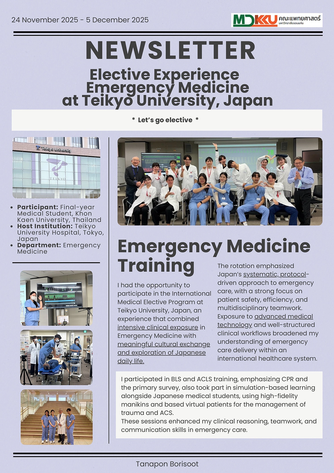 “Participating in the Emergency Medicine elective at Teikyo University allowed me to develop essential clinical skills through hands-on training, simulation-based learning, and close collaboration with medical staff in a high-standard healthcare environment.”