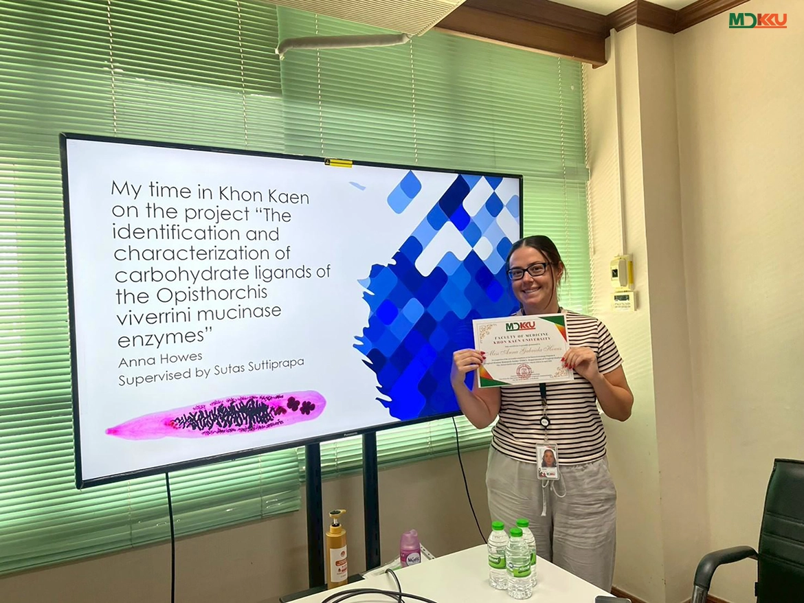 สำหรับการนำเสนอผลงานวิจัยในครั้งนี้ Miss Anna Gabriela Howes ได้นำเสนอหัวข้อวิจัย “Identification and Characterization of Carbohydrate Ligands of the Opisthorchis viverrini Mucinase Enzymes” ซึ่งเป็นการศึกษาวิจัยเชิงลึกด้านชีวการแพทย์ในสาขาโรคติดเชื้อ โดยมี รองศาสตราจารย์ ดร. สุทัศน์ สุทธิประภา เป็นอาจารย์ที่ปรึกษา