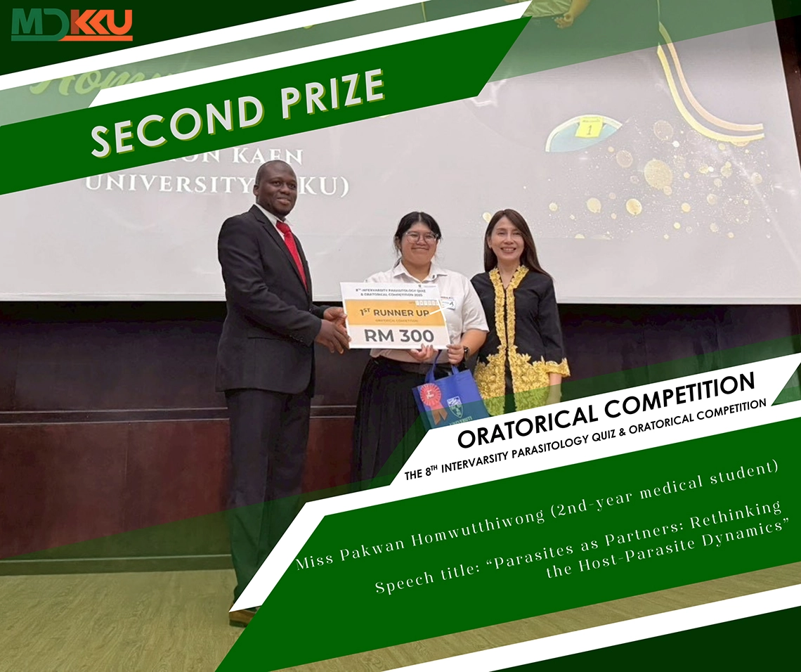 Medical students from the Faculty of Medicine, Khon Kaen University, participated in “The 8th Intervarsity Parasitology Quiz & Oratorical Competition – 2025” held on October 18, 2025, at the University of Malaya, Malaysia. The event brought together medical students from leading universities across Asia to foster international collaboration and academic excellence in the field of parasitology.