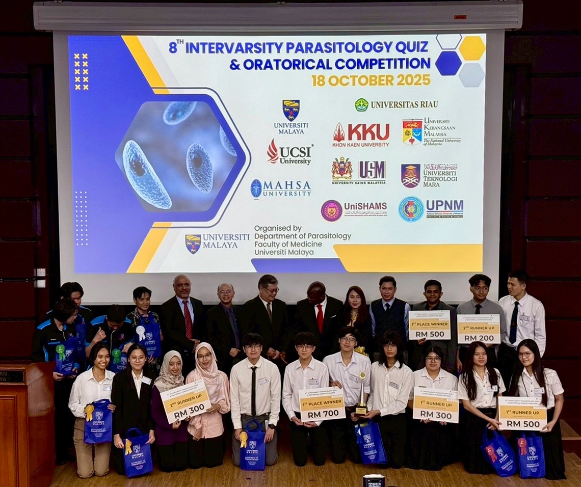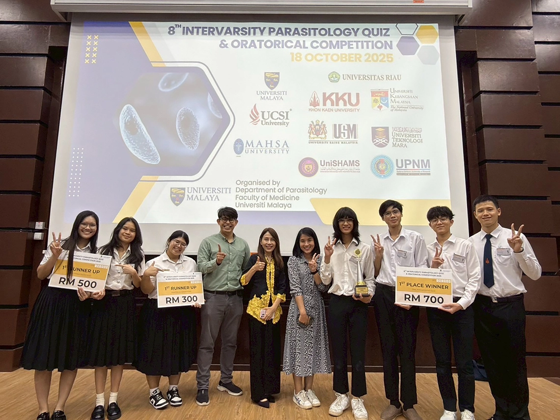 นักศึกษาแพทยศาสตร์ คณะแพทยศาสตร์ มหาวิทยาลัยขอนแก่น ได้เข้าร่วมการแข่งขันตอบปัญหาและกล่าวสุนทรพจน์ทางด้านปรสิตวิทยาระดับนานาชาติ “The 8th INTERVARSITY PARASITOLOGY QUIZ & ORATORICAL COMPETITION – 2025” ซึ่งจัดขึ้นเมื่อวันที่ 18 ตุลาคม 2568 ณ University of Malaya (Universiti Malaya) ประเทศมาเลเซีย โดยมีตัวแทนนักศึกษาจากสถาบันการแพทย์ชั้นนำทั่วภูมิภาคเอเชียเข้าร่วมอย่างคับคั่ง