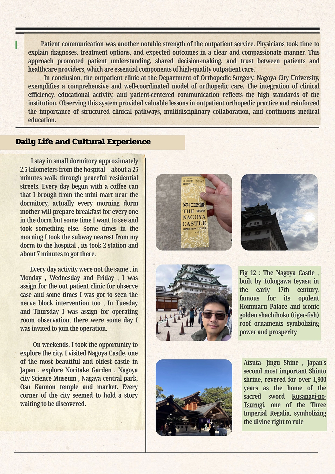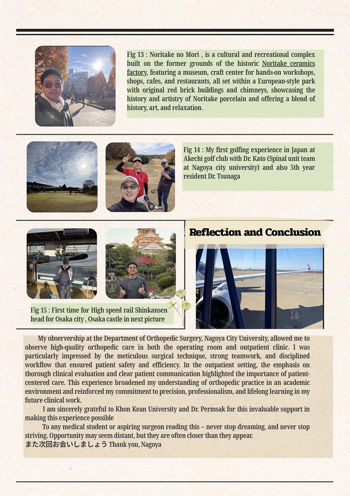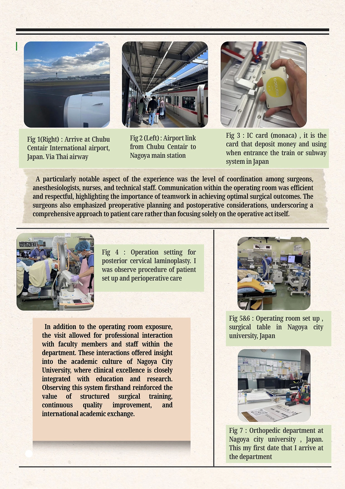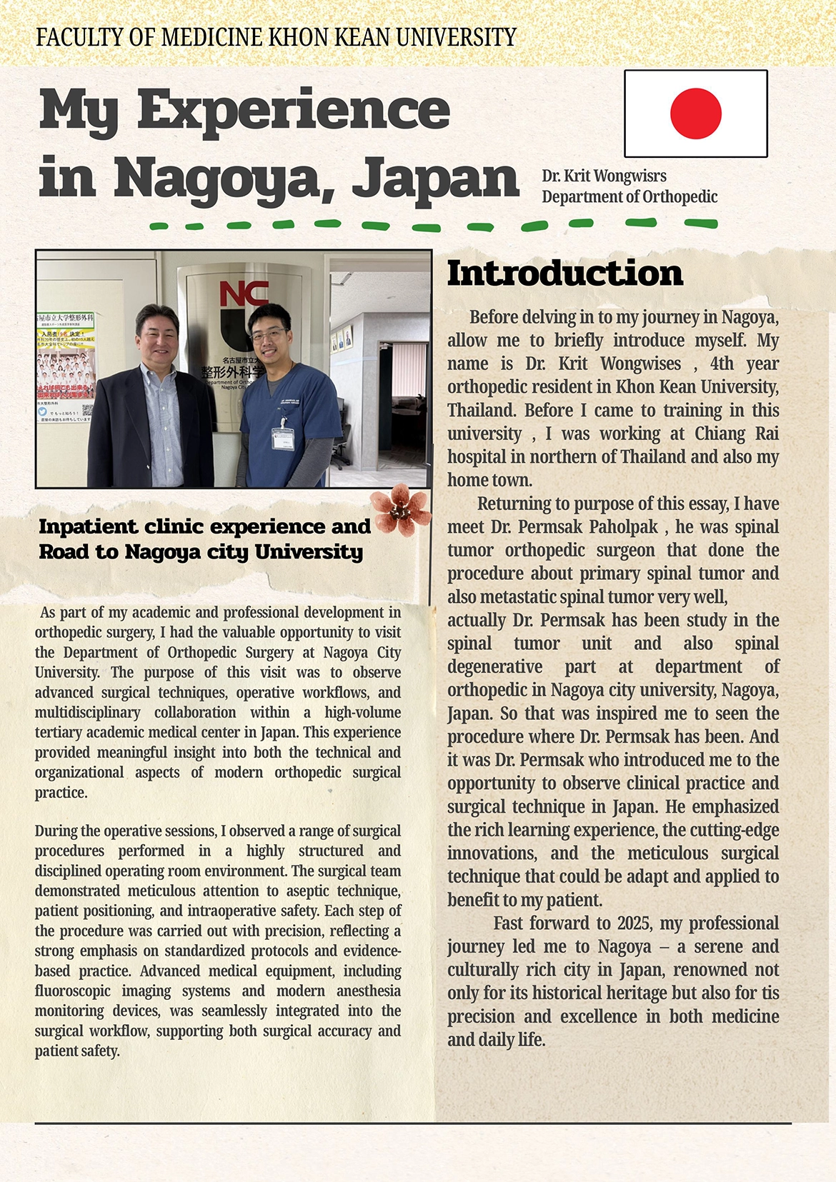 Dr. Krit Wongwises, a fourth-year orthopedic resident at Khon Kaen University, participated in a four-week academic exchange program at the Department of Orthopedic Surgery, Graduate School of Medical Sciences, Nagoya City University, Japan, from November 1 to 30, 2025.