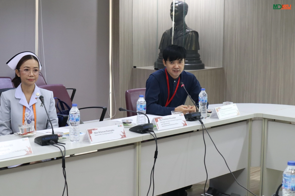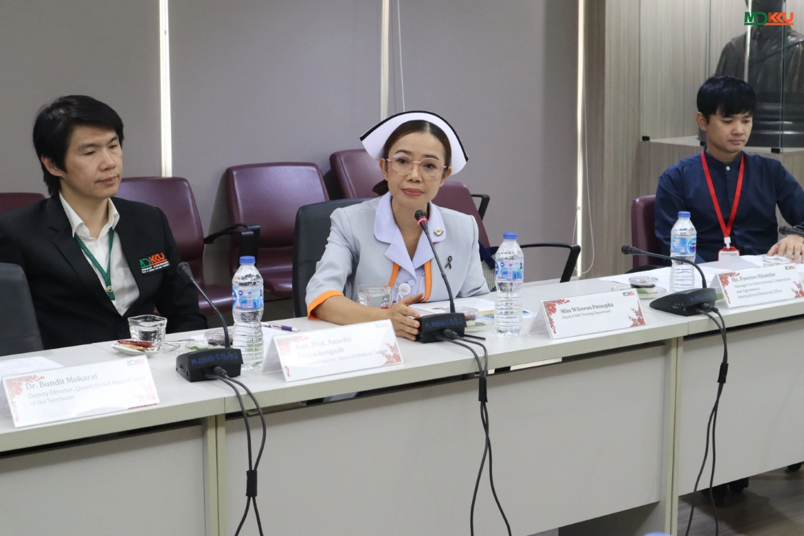 孔敬大学医学院方面,Assoc. Prof. Watcharin Loilome (胆管癌研究所所长)介绍了“胆管癌综合防治项目”。该项目采用全流程、一体化的患者照护模式,涵盖筛查、诊断、治疗及随访各个环节,并联动区域卫生服务网络,旨在降低疾病负担并提升患者获得治疗的可及性。与此同时,Dr. Bandit Mokharat(后勤与环境副院长)介绍了东北诗丽吉心脏中心的综合实力。该中心作为区域内心血管疾病三级专科诊疗中心,具备高水平的专业能力,并就医院管理及服务体系优化进行了交流,以高效应对大量患者的服务需求。