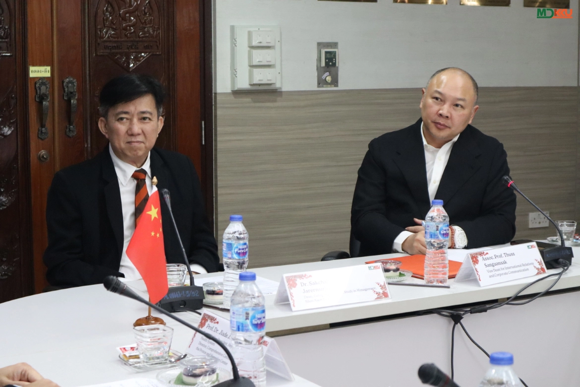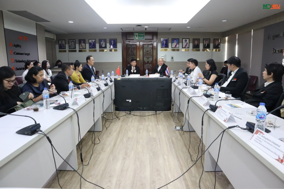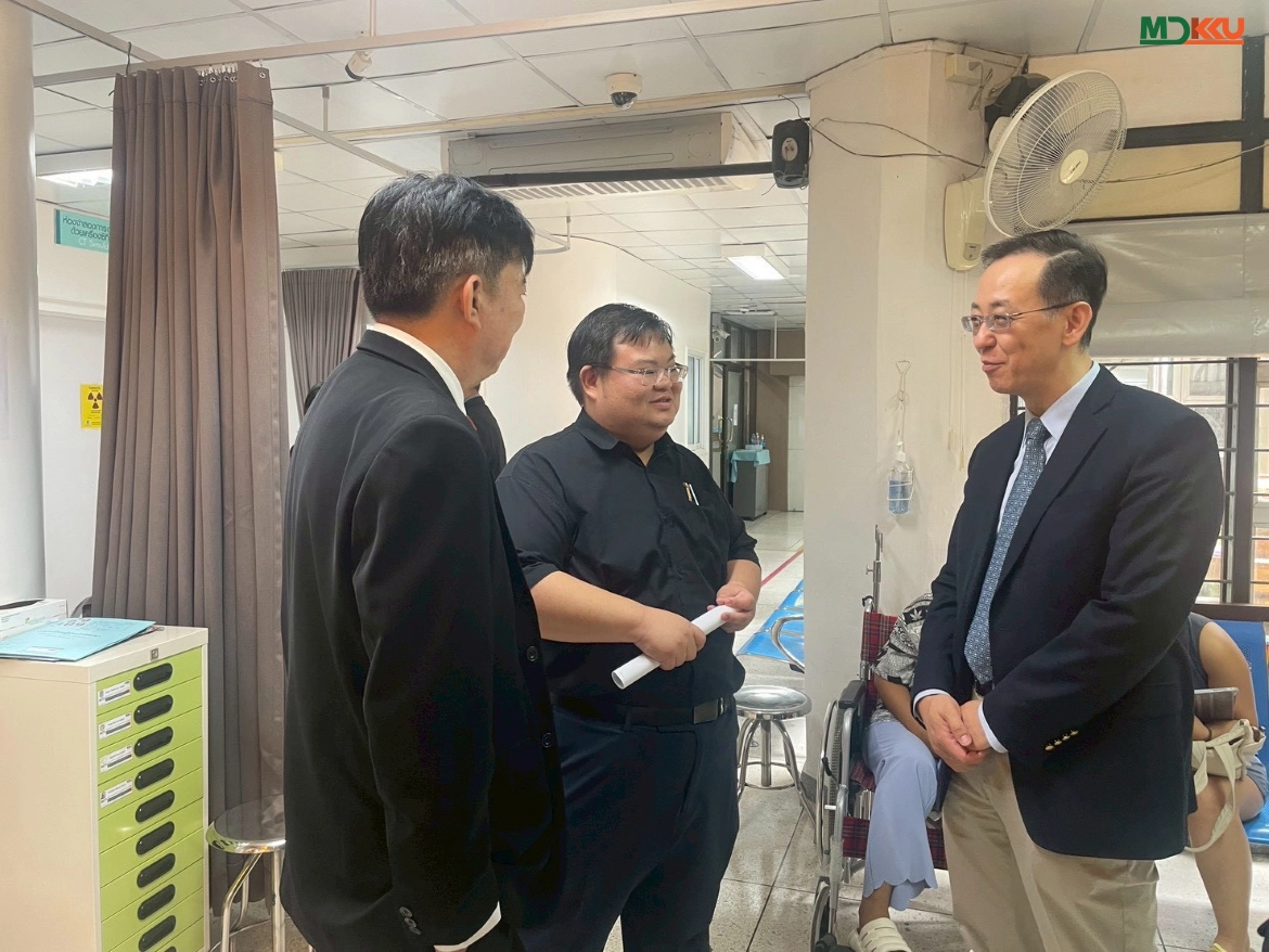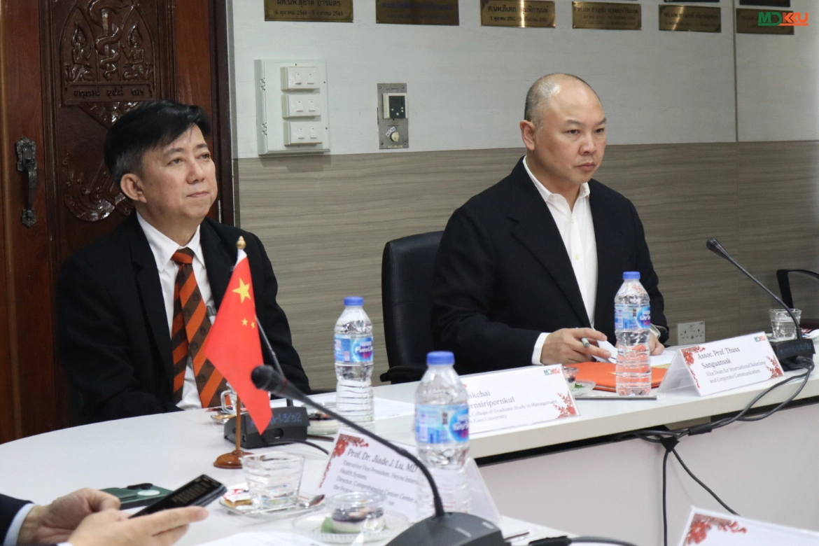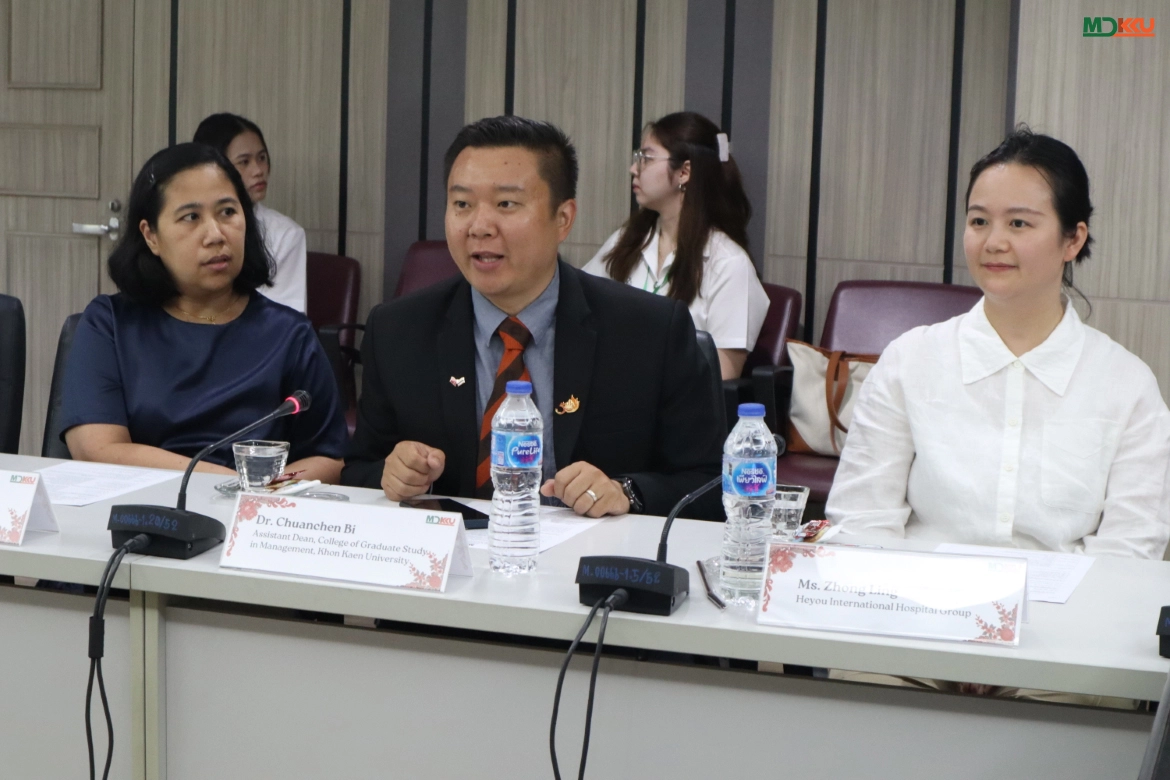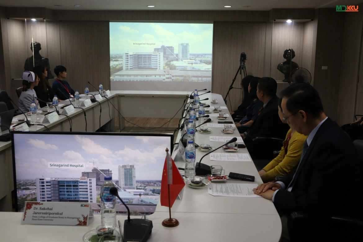 On April 20, 2026, the Faculty of Medicine, Khon Kaen University (MDKKU), welcomed a delegation from Heyou International Hospital Group (People’s Republic of China), led by Prof. Dr. Jiade J. Lu, Executive Vice President and specialist in Radiation Oncology. The delegation included Ms. Lili Tang and Ms. Zhong Ling, accompanied by executives from the College of Graduate Study in Management, KKU, led by Dr. Sakchai Jarernsiripornkul, Dean, and Dr. Chuanchen Bi, Assistant Dean, along with Ms. Nakarin Wichakot and Ms. Yuwathida Boonmak. The visit aimed to discuss cooperation in medical services, hospital management, and academic research.